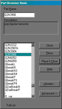 Type Q in the Part Name field, select the Q2N3906 part, then press Place & Close.