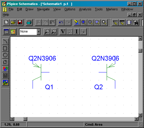 We want to change the Is parameter (saturation current) from its current value of 6.734f (that’s 6.734E-15) to 10 times that value. Edit the value to 67.34f and click OK to save it. There will be no indication of this change on the schematic. In order to remind yourself of the change, you can add a text box. Use Draw/Text or Draw/TextBox to place text anywhere on the drawing. Place a text box with “r = 10” near Q1. Clean up any spurious marks using CTRL-L (View/Redraw).