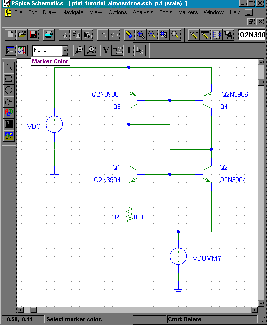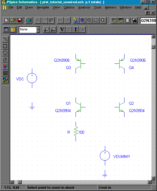 Next, place two Q2N3904 NPN BJT’s on the schematic. Label them Q1 and Q2. Also place two VSRC voltage source parts. Label one VDC and the other VDUMMY. Place one resistor (R) and label it R. Double-click the value text block (default is 1k) and change it to 100. Finally, place two copies of EGND (earth ground). After placing, naming, and arranging the parts, your drawing should now look similar to this: