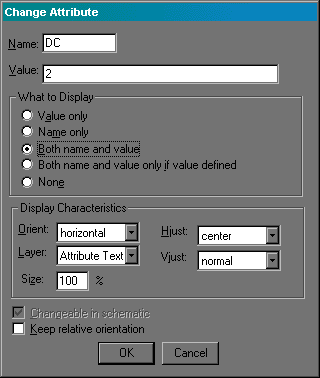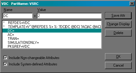 Check the radio button under “What to Display” labeled Both name and value. Click OK, then OK to return to the schematic. The text DC=2 should appear near the VDC part. Drag it to a suitable location.