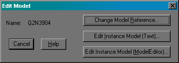 We want to set the area ratio of Q1 to Q2 to be r = 10. We will do this by modifying the saturation current parameter of Q1. Select Q1 by clicking on it. It should turn red. Then from the main menu select Edit/Model. The following dialog box should appear:
