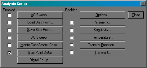Now you are ready to setup the simulation. Select Analysis/Setup or click the Setup icon
