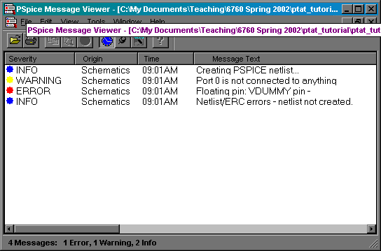 Careful reading of the error messages can usually help pinpoint the problem. In this case, the wire connecting VDUMMY to ground was left out. Close the error box, fix the schematic, and run the simulation again.