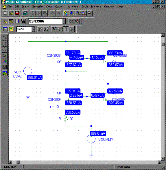 The text boxes containing current values can be dragged using the mouse. When a box is selected, a red arrow will appear indicating the branch and direction of the referenced current, as shown in the close-up of the PTAT current below: