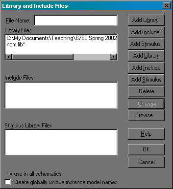 The second, nom.lib*, contains the factory definitions of all parts supplied with this installation. The trailing asterisk indicates that this is to be available to all schematics. This file is located somewhere in the PSPICE installation directory structure on each machine.