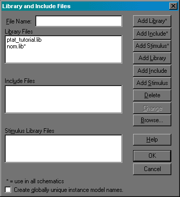 PSPICE keeps track of device parameters (for BJT’s, for example) in separate files called library files (*.lib). These files are required in order for the simulation to run. Most library file errors occur when a user copies a simulation from one folder or machine to another, and fails to keep the accompanying library file(s) intact with the Schematics (.sch) file. The built-in library files contain the factory list of parts supplied with PSPICE, and are usually not a problem since each installation of PSPICE contains them by default. However, if you modify a library part or create a blank part from scratch (breakout part), Schematics will create new library file(s). The library files being used in a current schematic can be viewed and manipulated by choosing Analysis/Library and Include Files. Here is an example from the PTAT simulation: