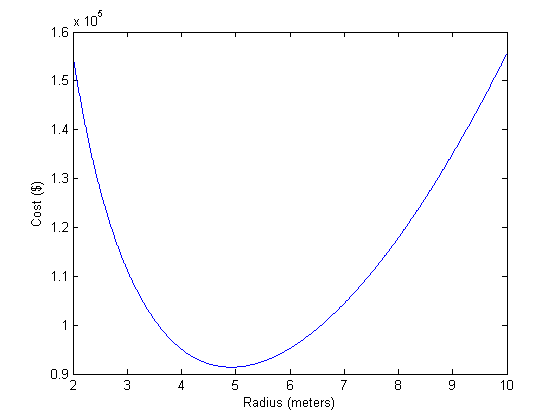 clear, clc, format compact, format short g r = [2:0.01:10]; V = 500; h = @(r) (V-2*pi*r.^3/3)./(pi*r.^2); cost = 600*pi*r.*h(r)+800*pi*r.^2; plot(r,cost) xlabel('Radius (meters)') ylabel('Cost ($)') [radius,mincost] = ginput(1) hmin = (V-2*pi*radius.^3/3)./(pi*radius.^2) % min cost found using fminbnd hcost = @(r) 600*pi*r.*h(r)+800*pi*r.^2; mincost_using_fminbnd = fminbnd(hcost,4,6)