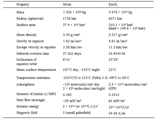 Figure 1. Earth and Moon Comparison ( (Heiken, Vaniman, & French, 1991) Figure 1, from the Lunar Sourcebook CD (Heiken et al., 1991), compares the earth and the moon. The moon is 1/80 the mass of the earth and about ¼ the diameter. The gravity is 1/6 that of earth. Note the lunar day temperature extremes, almost no atmosphere when compared to earth, and the time for the moon to rotate around the earth is 27.322 days (sidereal month). Temperatures can be extremely high and extremely low. Chapter 5 discusses the lunar environment in detail. Excavators