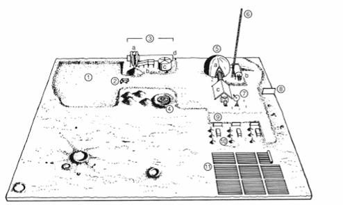 Many lunar base architectures have been proposed, Figure 6 and 7 shows two architecture. In Figure 7 Location 1 is a pit where regolith has been excavated, and brought by a hauler (2) to a processing plant (3) where oxygen is extracted from the regolith. Other parts of the base include a nuclear reactor (4), habitat and airlocks (5), radio tower (6), dish antenna (7), radiators (8) and (9), fuel cells (10) and Ga-As photovoltaic solar cell arrays (11).)