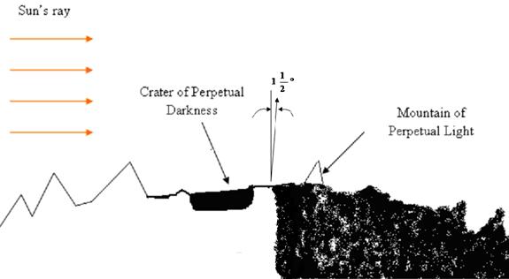 Figure 6. Concept of a Lunar Base Architecture ((Heiken et al., 1991) Figure 7. Concept for a Lunar Base at a Pole (Burke, 1985) Because the moon’s axis of spin is only +/-1.6 degrees with respect to its orbit around the sun, permanently-shadowed “dark” craters may exist near regions where the Sun never fully sets, as shown in Figure 8. The combination of a dark cold craters (perhaps as low as 40 degrees K) with continuous sunlight nearby (on the mountains) can be put to use for thermodynamic cycle power generation. Burke (Burke, 1985) in Figure 7 proposed lunar base with a rotating solar mirror to collect the sunlight, and always pointing toward the sun. The light from the sun is concentrated to heat a fluid in a pipe, powering the thermodynamic cycle, with the heat rejected to a radiator located in a cold crater. Solar cells controlled to always point near the sun could provide continuous power.