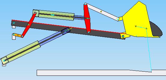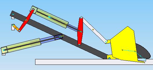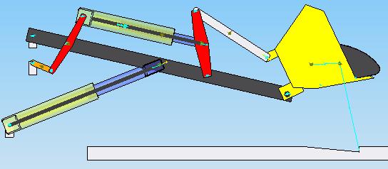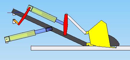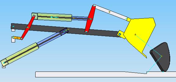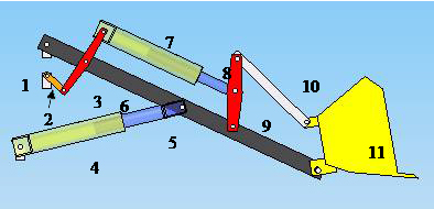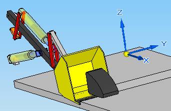 Figure 1‑1. Excavator assembly in Solid Edge To demonstrate the process, a CAD package (Solid Edge V20) was used to draw and assembly an excavator shown in Figure 1-1. Individual parts were created first, and then assembly relationships applied. The excavator would be pinned at three points on the left side of the figure to a rover (for this demonstration they are attached to ground part 1). The figure shows 12 pin (or revolute) joints and 2 translational joints in the cylinders. Each joint removes 2 degrees of freedom. With 10 moving parts, Gruebler’s equation calculates this system to have 2 degrees of freedom. Hence two actuators (e.g. linear motors) will be able to operate this system, and obvious locations for these would be inside the cylinders, between parts 4 and 5, and 7 and 8. · Actuator power and force requirements, and link dimensions sized for the intended lifting and digging operation. The digging force mathematical model (Chapter 5) can be added as an applied force. Use a multibody dynamics simulation software here like ADAMS. · Stresses throughout the mechanism parts induced by digging, from combined multibody dynamic simulation and finite element analysis. · The temperature of any material point on a part (created by solar radiation and the environment), by finite element analysis. · Thermal stresses and strained induced by temperature differences within a part, and across part joints, again using finite element analysis. Input boundary conditions determined by methods presented in “thermal control” chapter 7. · Control laws that define actuator motion based on sensor input, to automate and/or monitor the digging operation. Use a multibody dynamics and/or a control system design software like MATLAB.