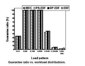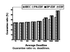 The results reported in the left Figure reveal that all of the four algorithms deliver a 100% guarantee ratio under the Sparse Distribution. The reason for this is that the average request deadline is generally much shorter than the sparse idle threshold, which means that even though IBEC aggressively slows down the processing pace of disk requests, their deadlines can still be satisfied. When we applied a Cluster Distribution pattern, the performance of the four algorithms goes down when the parameters of the Cluster Distribution increase. This is because there were a large number of requests arrived during a burst of incoming requests. Consequently, all the algorithms can only guarantee the deadlines of a small part of them.
