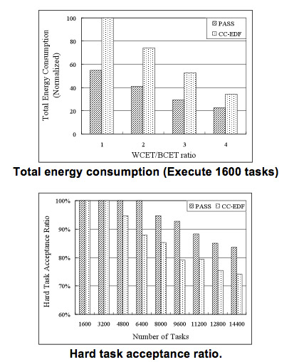 Now we compare the performance of PASS against CC-EDF. We performed simulations for different task loads in order to examine the performance consistency. With respect to Hard Task Acceptance Ratio, from the above Figure we observe that PASS yields 10% better performance on average than CC-EDF. When the number of tasks is below 6400, PASS guarantees that all hard tasks can meet their deadlines. As the number of tasks further increases, PASS is still able to schedule most of the hard tasks while EDF is no longer able to reach similar performance level. The reason is because PASS always schedules hard tasks first, which helps meet hard tasks’ deadlines. CC-EDF does not consider task priority, which results in a number of un-schedulable hard tasks.