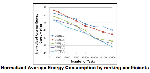 With respect to Normalized Average Energy Consumption, as shown in the following Figure, we observe that DEES (2, 1) consumes the least amount of energy while DEES (0, 1) consumes the most. DEES (2, 1) considers both energy consumption and deadline constraints when dispatching tasks to neighbors. Doing so can reduce the energy cost per task. On the other hand, DEES (0, 1) schedules fewer tasks since it only cares about energy consumption when dispatching tasks. Moreover, given that more tasks miss their deadlines at each site; additional data replications may be needed. Therefore it relatively consumes more energy to replicate data and transfer the tasks.