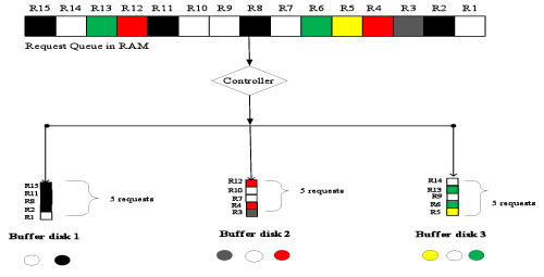 The basic idea of heat-based mapping is that blocks in data disks will be mapped to buffer disks based on their heat (access frequency). Our goal is to make the accumulated heat of data blocks allocated to each buffer disk is exactly the same or at least close. In other words, the temperature of each buffer disk should be in the same level. Here the temperature of a buffer disk means the total heat of all blocks existing in this buffer disk. For example, in current request queue, the heat of block 1-6 are 5, 4, 1, 2, 1, 2 respectively. Therefore, block 1 is cashed to buffer disk 1, block 2 and 3 are copied to buffer disk 2 and block 4, 5 and 6 are mapped to buffer disk 3. In this way, the temperature of each buffer disk is 5. The following figure depicts the dispatch results of heat-based load balancing strategy. Note that there are 15 requests cashed in the RAM buffer and they are going to be dispatched to different buffer disks by the controller. Requests have different colors, which represents they will access different data blocks. For example, request 1 will access the data block1 existing in data disk 1 and request 6 will access the data block6 existing in data disk 6.