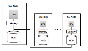 smart-disk node), can be accessed by the host node via NFS. Each data-intensive processing